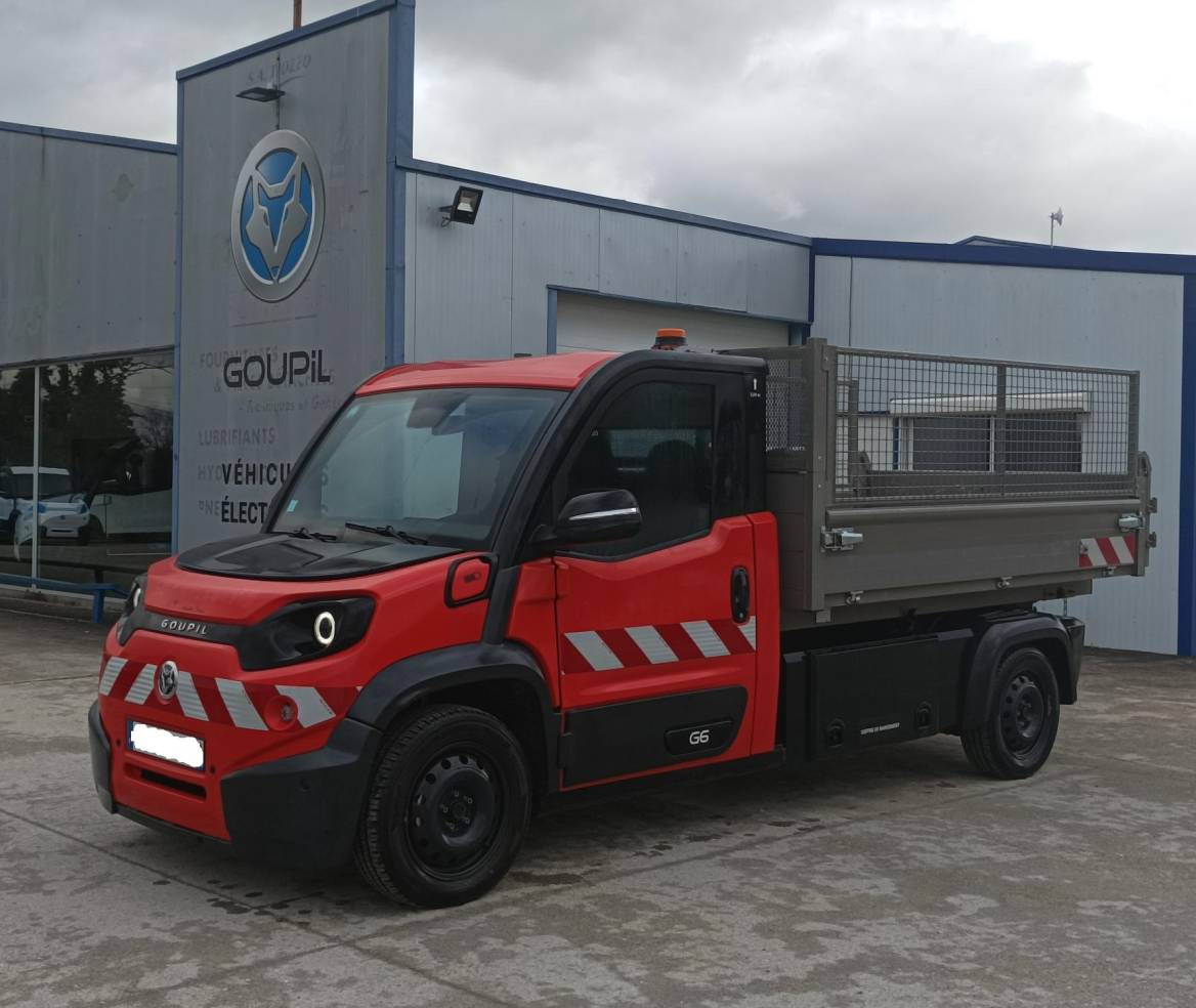 Benne basculante avec rehausses grillagées et portes vantaux arrières à décrochement automatique · Cabine couleur rouge RAL 3020 avec pare-brise chauffant et direction assistée · Climatisation reversible l 1800 W, fermeture centralisée, double DIN (autoradio/afficheur/caméra), radar avant et caméra de recul, bouton métier · Bandes réfléchissantes l classe 2 feux avant / arrière de pénétration, et feu à éclats · Cordon de charge 5m mode 3 type 2/type 2, coffre de rangement transversal